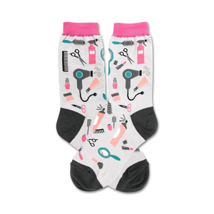 Pamper your mom's feet with the Hair Accessories Mother's Day Crew Socks. Featuring a cheerful print of hair styling tools and accessories in bright colors, she'll feel loved and pampered every time she puts them on. The gray socks with pink toes and cuffs add a touch of playful sophistication.
