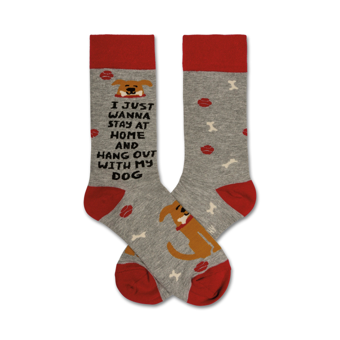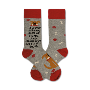 Comfort never felt so casual and fun! You won't just wanna stay home and hang out with your dog in these cozy crew socks. Made for women who love chill days and love their dog even more, they're made of gray with red toes, heels, and cuffs, featuring a pattern of red balls and brown dog bones, splashed with the words 'I just wanna stay at home and hang out with my dog' on the front in red. Remind yourself (or someone you love) of the simple pleasures in life with these fun socks.