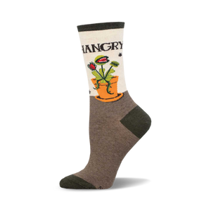 Meet the 'Hangry' socks, where fashion feeds your fun side! These crew-length charmers feature a quirky Venus flytrap illustration, visibly voicing its Hangry status perfect for days when your mood mirrors its munchie-craving message. Ideal for casual outings or making loungewear statements, they bring a bite of humor to your wardrobe. Rock them at your next brunch or lazy weekend lounge; they're sure to stir up smiles and start conversations. Why wear your emotions on your sleeve when you can wear them on your socks? Grab a pair today and flaunt that fun, hangry spirit!
