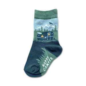 Calling all campers, glampers, and adventure enthusiasts! Our Happy Camper socks are the perfect foot accessory for any outdoor outing. Featuring a vibrant pattern of mountains, trees, and a cozy green camper, these socks will put a spring in your step and a smile on your face. Whether you're hiking, fishing, or just relaxing by the campfire, these socks will make you feel like you're on a permanent camping trip!