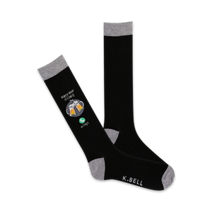 Slip on a pair of these "Happy Hour is Calling" socks and let the good times brew! These black crew socks feature gray toes, heels, and tops with two beer mugs and a phone, reminding you that it's always 5 o'clock somewhere. Perfect for the beer lover in your life.