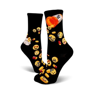 Feelin' blue? Take the Red Pill, not the Blue Pill! These vibrant black socks are covered in a bunch of cheery, fun yellow emoji faces and red and blue pills. Put them on and join the Feelgood Crew!