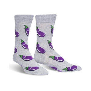 Eggplant lovers unite! These purple crew socks for men are a fun and lighthearted way to show your appreciation for the mighty eggplant. With an allover pattern of smiley-faced eggplants, these socks are sure to bring a smile to your face. The eggplant is also a symbol of longevity and good luck, so you'll be wearing more than just a fun pair of socks when you put these on.