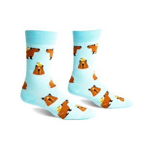Got a soft spot for the world's most relaxed rodent? These socks feature cute capybaras hanging out on a calm, light blue background. You'll spot several of these laid-back creatures, some visible in profile, others just their sweet faces. Look closely and you'll even see a few sporting tiny yellow rubber ducks on their heads – because what's more chill than a capybara with a duck hat? There are also subtle white splash shapes visible, hinting at their favorite watery hangout spot. The top cuffs are a ribbed blue, matching the relaxed vibe perfectly. They're basically a hug for your feet, full of happy little capybaras.