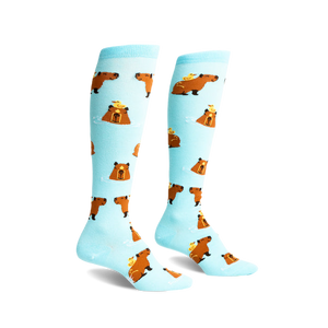 Got a soft spot for chill vibes and the world's most relaxed rodent? These socks are basically a wearable happy place. They come in a light, calming blue, like clear water, and are covered with a pattern of adorable brown capybaras. You'll spot some just chilling, while others are shown partly submerged, looking perfectly content. And the best part? Each capybara has a tiny, bright yellow duck perched right on its head, adding an extra splash of unexpected joy to your feet. They're a little bit quirky, a lot cute, and just the thing for anyone who appreciates unique designs and laid-back animal friends.