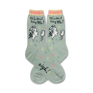 Anyone who's ever found themselves mirroring a melodramatic sigh can now wear their heart on their sleeve or rather, their sass on their feet. These vibrant green "Hard Being Me" crew socks sport a charming illustration of a woman eye-rolling at her reflection. Adorned with the words "It's So Hard Being Me!" these socks are perfect for days when you're feeling playfully dramatic or need that extra bit of flair for your ensemble. Hosting a girls' night in or strutting into a casual Friday? Let these socks tell the world exactly how tough (or how fun) being you can be! Why not grab a pair today and flaunt your beautiful burdensome self?