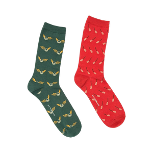 Show your love for Harry Potter and one of the most beloved house elves, Dobby, with these vibrant and fun crew socks! The green sock features a magical pattern of golden snitches with wings, and the red sock showcases a pattern of red and yellow broomsticks. Perfect for both witches and wizards, these socks are sure to add a touch of magic to your everyday style. Whether you're conjuring up spells or simply running errands, these socks will keep your feet comfortable and stylish.