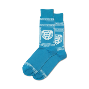 Have A Nice Day Socks: Fashion is all in the footwork. Everyday's a chance to put your best foot forward and dazzle 'em with your footwear. Be the ray of sunshine peeps need to brighten their day when you rock these Have A Nice Day socks. The blue and white colorway ensure you'll walk on the bright side wherever you go. These bad boys may not make your life peachy keen, but they'll definitely make your feet smile. Stride boldly and let those good vibes radiate from the ground up.