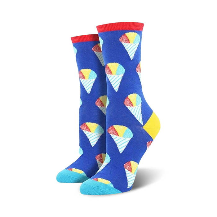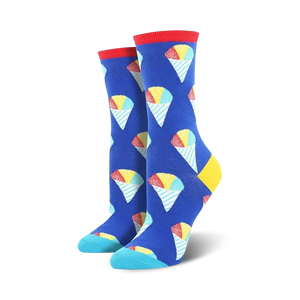 Looking for a way to cool down your feet? Slip on a pair of these refreshing women's novelty crew socks! Each fun pair features tri-colored snow cones printed all over on a blue background. The cuffs are red, the heels are yellow and the toe lines are a light blue hue. You don't have to go to Hawaii to enjoy this deliciously sweet treat anymore!