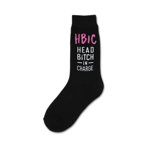 Style meets humor and power in these Head Bitch In Charge crew socks. Featuring a bold design and vibrant pink text, these black socks declare your authority with playful audacity. Step into a pair of these HBIC socks and strut your stuff like a boss. Caution: Wearing these socks may result in an uncontrollable urge to take charge and conquer the world.