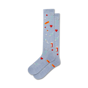 Sock it to 'em with Healthcare Worker-themed socks! The vibrant design features red hearts, orange pill bottles, blue thermometers, green stethoscopes, and brown adhesive bandages on a light blue background. Perfect for anyone in the medical field, these crew length socks will show off your caring side while keeping your feet comfy. Fun fact: Did you know that during World War I, nurses were given 4 pairs of stockings annually as part of their uniforms? Stay healthy and spunky in this delightful pair of socks!