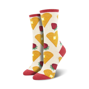 Start your day with a hearty serving of breakfast served right on your feet! These Heart Smart Breakfast socks feature a pattern of heart-shaped waffles topped with juicy strawberries and pats of butter. They're sure to get you craving a stack of pancakes and a cup of coffee! Perfect for those lazy mornings when you just want to stay in bed and have breakfast in bed minus the mess. Show off your love for waffles and all things breakfast with these fun and delicious socks.