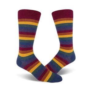 Calling all fashion enthusiasts! Get ready to add a dash of vibrance and pride to your sock collection with our Heather Rainbow Striped Crew Socks, made exclusively for men. These socks feature a stunning array of colors, starting with a deep dark red, smoothly transitioning to fiery orange, cheerful yellow, refreshing green, tranquil blue, and finally ending in majestic purple. Whether you're attending a Pride event, showing your support for the LGBTQ+ community, or simply injecting some fun into your everyday wardrobe, these socks are sure to make a statement. Plus, they're crafted with the utmost comfort in mind, ensuring you feel as good as you look. It's time to let your feet do the talking and spread a message of love and equality, one step at a time.