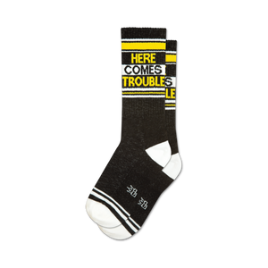 Get ready to stir up some fun with our "Here Comes Trouble" socks! Decked out in striking black, accented with playful yellow and white stripes, and sporting bold, cheeky lettering on the front, they're your perfect partners in crime for any adventure. These socks don't just whisper your sassy side; they shout it from the rooftops. Ideal for trendsetters aiming to inject a dash of daring into their daily wear, from the boardroom to the dance floor. Slip into a pair and let your feet do the talking – it's time to make every step a statement!