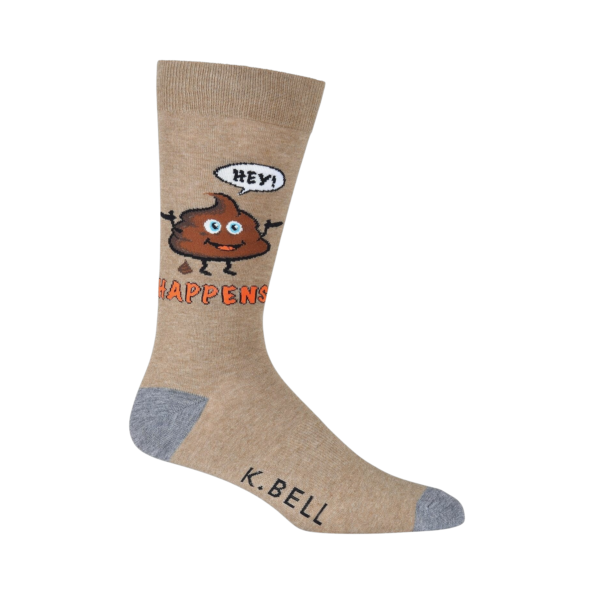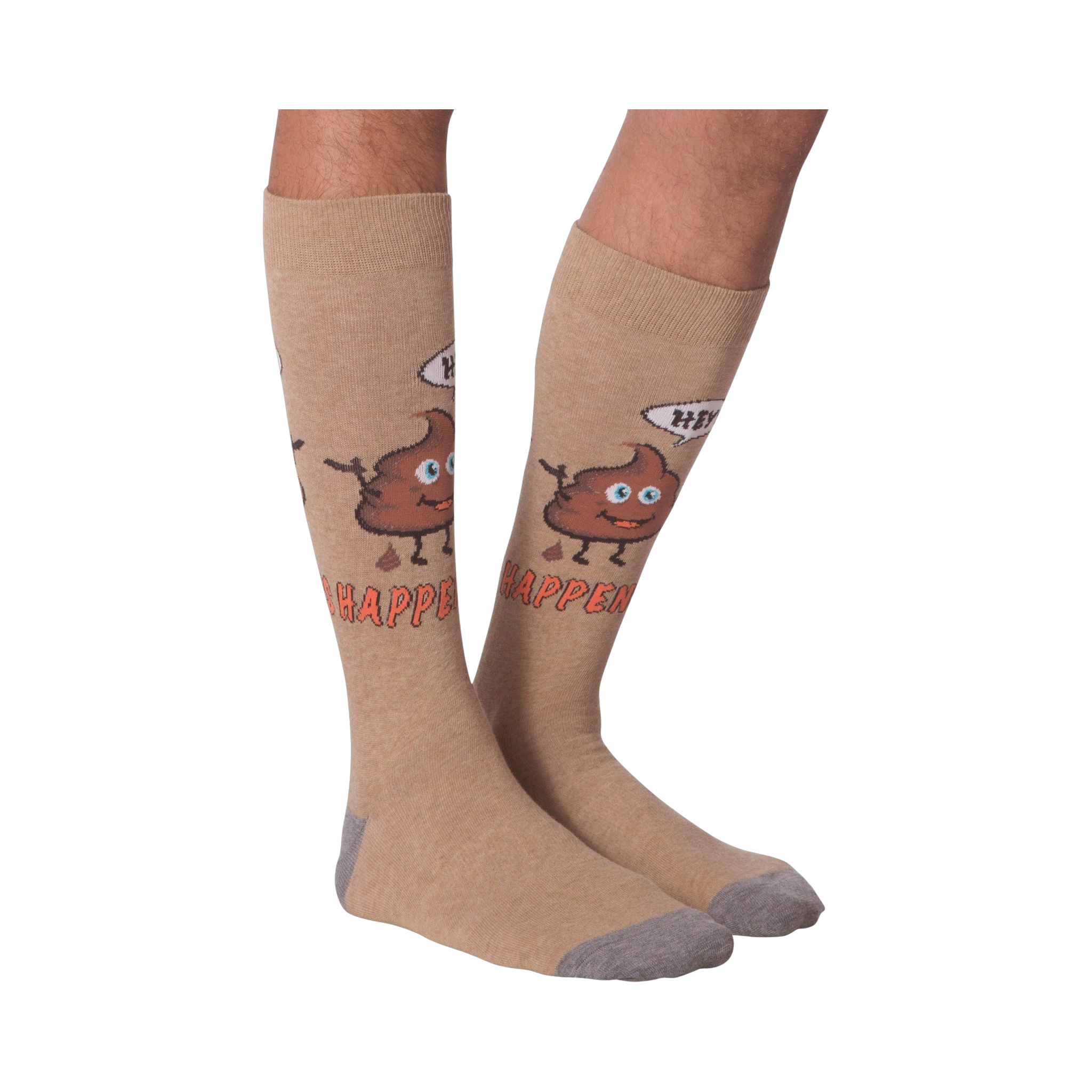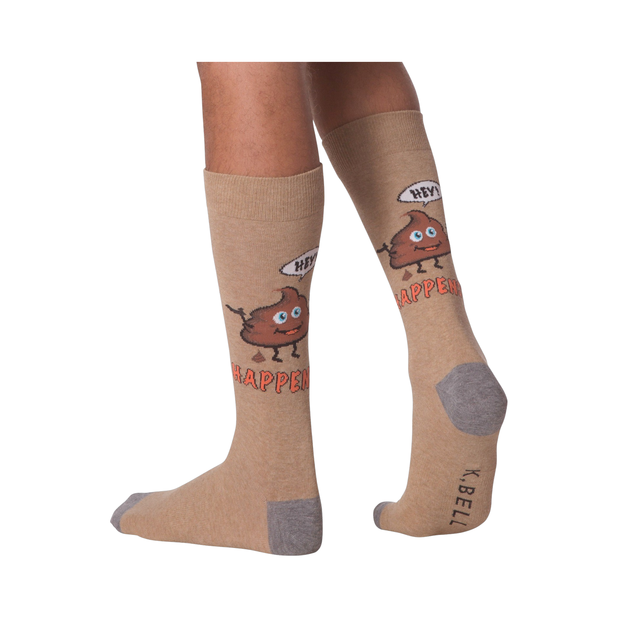 Life can't be all rainbows and butterflies. Sometimes things go wrong and there is nothing wrong with being a realist! This pair of gray and tan crew socks will show you keep things real. Each sock features a smiling pile of poo saying "Hey!" with the word "happens" beneath him. These funny socks make a great gift.