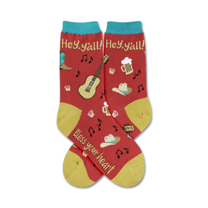 You bet! These 'Hey Y'all' novelty socks got big country energy! Country music icons like guitars, cowboy boots, hats, and beer mugs are dancing on these red socks to the tune of 'Bless Your Heart.' Git up and two-step your way into these cowgirl crew socks and let the good times roll!