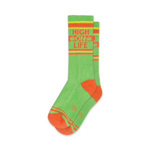 These HIGH ON LIFE socks are the perfect way to add a touch of fun and energy to your wardrobe. With their vibrant green color and bright orange and white HIGH ON LIFE lettering, these socks are sure to turn heads wherever you go. Plus, they're so comfortable, once you put them on you'll be feeling HIGH ON LIFE!