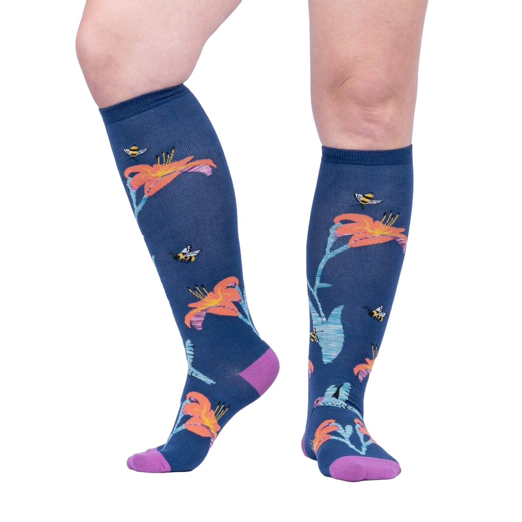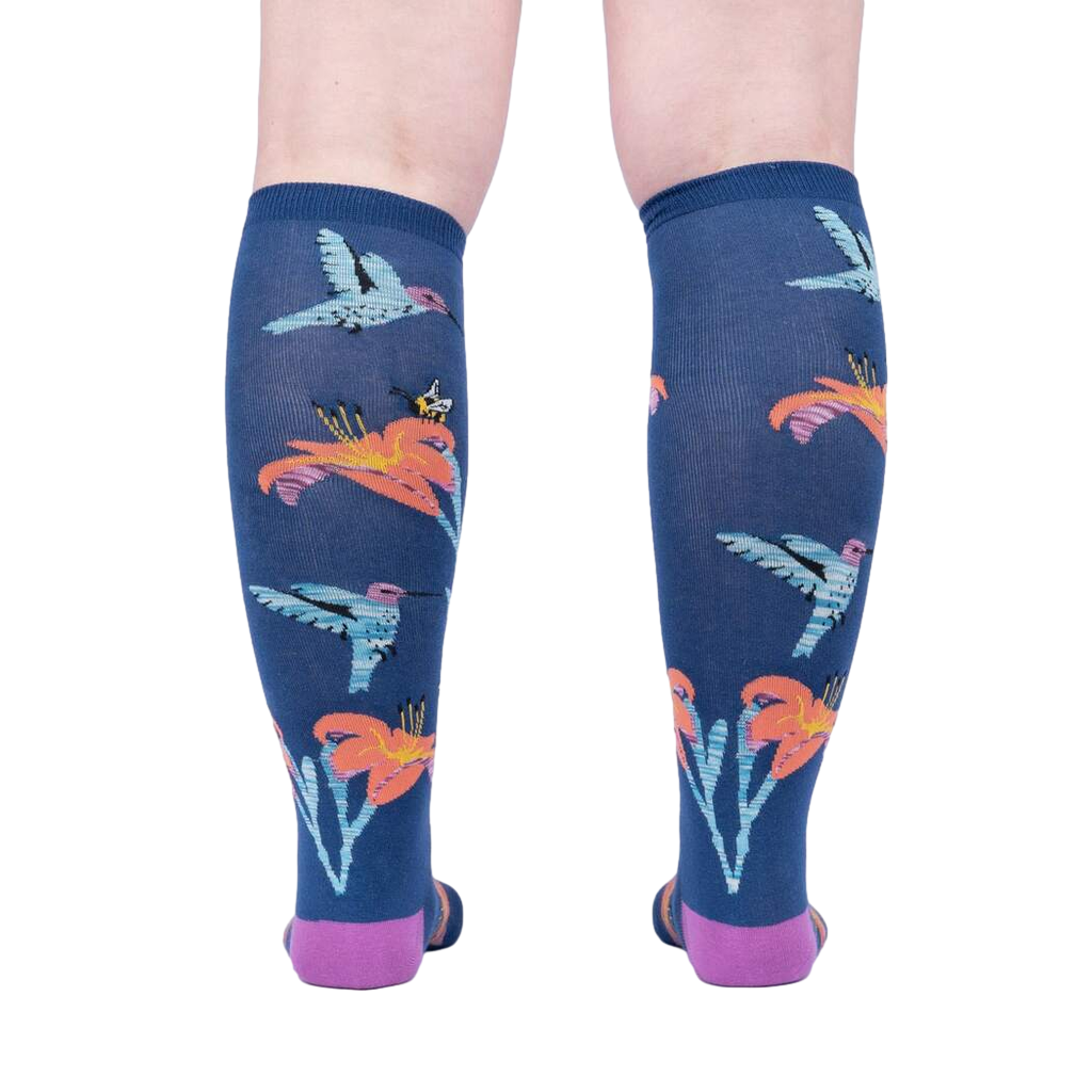 Honeys, be the bee's knees in these knee-high Hmmmmmingbird socks. With a pattern of hummingbirds, bees, and flowers in bright blue, these socks will make you feel like you're frolicking through a field of flowers on a summer day. Plus, the comfy fabric will keep your feet feeling fly all day long.