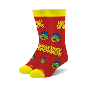 Raise your sock game with Honey Smacks! Featuring the iconic Sonny the Honey Smacks frog mascot rocking a blue hat, these crew socks are a crunchy, sweet, and delicious treat for your feet. Wear these bold and colorful socks and let your feet take a delightful trip down memory lane. Sweeten up your day with every step.