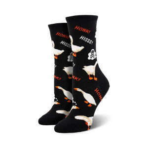 "Fly in style with our Honk Honk socks! These delightfully quirky knee socks are guaranteed to send your spirits soaring. Picture this: a flock of majestic white geese, their beaks and feet a vibrant shade of orange, emblazoned on a backdrop of bold black. And to amp up the fun, we've added some playful skull and crossbones, along with quirky speech bubbles declaring "Honk!" and "Hiss!" Rock these socks and prepare to be the life of the party. Consider them your personal cheer squad, reminding you to embrace your inner silliness and quack your way through life!"