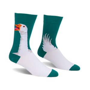 Sometimes you just need to make some noise. These socks are ready for all your big statements, featuring a bold design on a deep teal background. One sock prominently displays a white goose with an open orange beak, looking like it's letting out a big "Honk!". The other sock features a stylized white wing, creating a cool matching set. The main foot and toe areas are white, contrasting nicely with the teal cuffs, heels, and visible wing tips. They're a fun way to show off your personality, perfect for anyone who appreciates a bit of farmyard flair. Just a friendly reminder, these socks won't actually honk, but they will definitely get noticed.