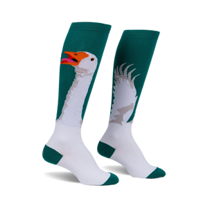 A bold statement for your feet, these socks feature a big, honking goose. The design starts with a cool teal green on top, blending into crisp white towards the foot. On one visible side, you'll see the goose's head, beak wide open with a pink tongue showing, clearly mid-honk. The other sock shows a large, detailed white wing. The goose's white body extends down from the green top. Teal heels and toes complete the look. They're perfect for when you want your feet to make some noise, even if you’re just chilling.