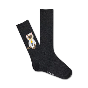 Welcome to the Gray Cat Hood: Where style meets coziness and amusement. These crew socks bring the magic of cats to your feet with an adorable gray backdrop and a white cat sporting a regal gold necklace on the left sock. Walk on the wild side and let your paws do the talking. Get ready to elevate your sock game and let these kitty kicks steal the show.