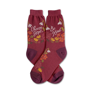 These Hope Floral womens' crew socks are a mesmerizing burgundy and adorned with white blooms. Soft and intricate, they'll cradle your feet as they make their grand debut! From the moment you slip them on, you'll feel as if you're floating on a petal-strewn cloud. And as if that weren't enough, these socks carry a message of hope and kindness ”just what you need to keep your spirits high all day long. So wear them loud and proud, because your feet deserve nothing but the best!