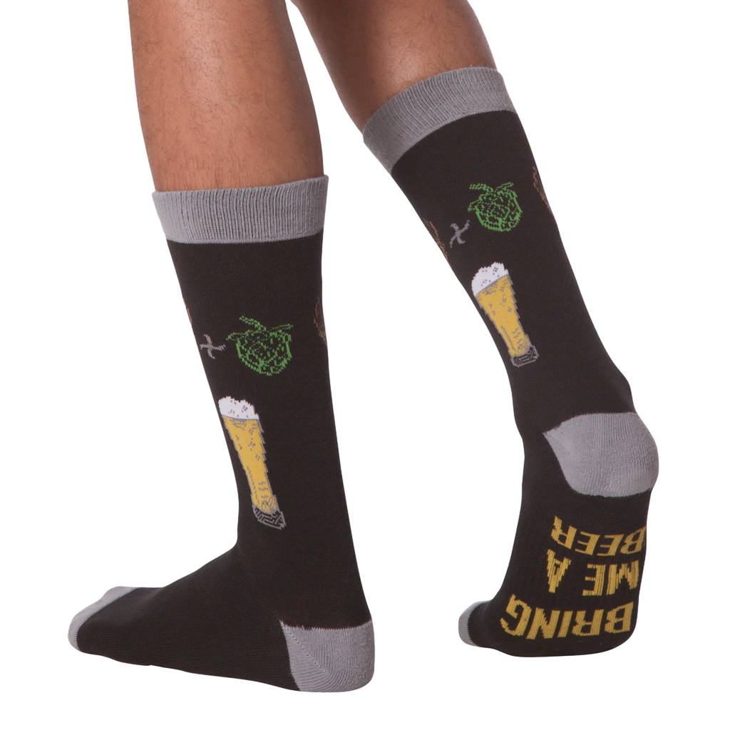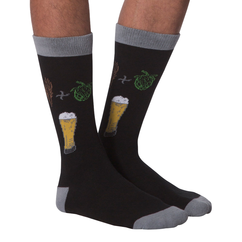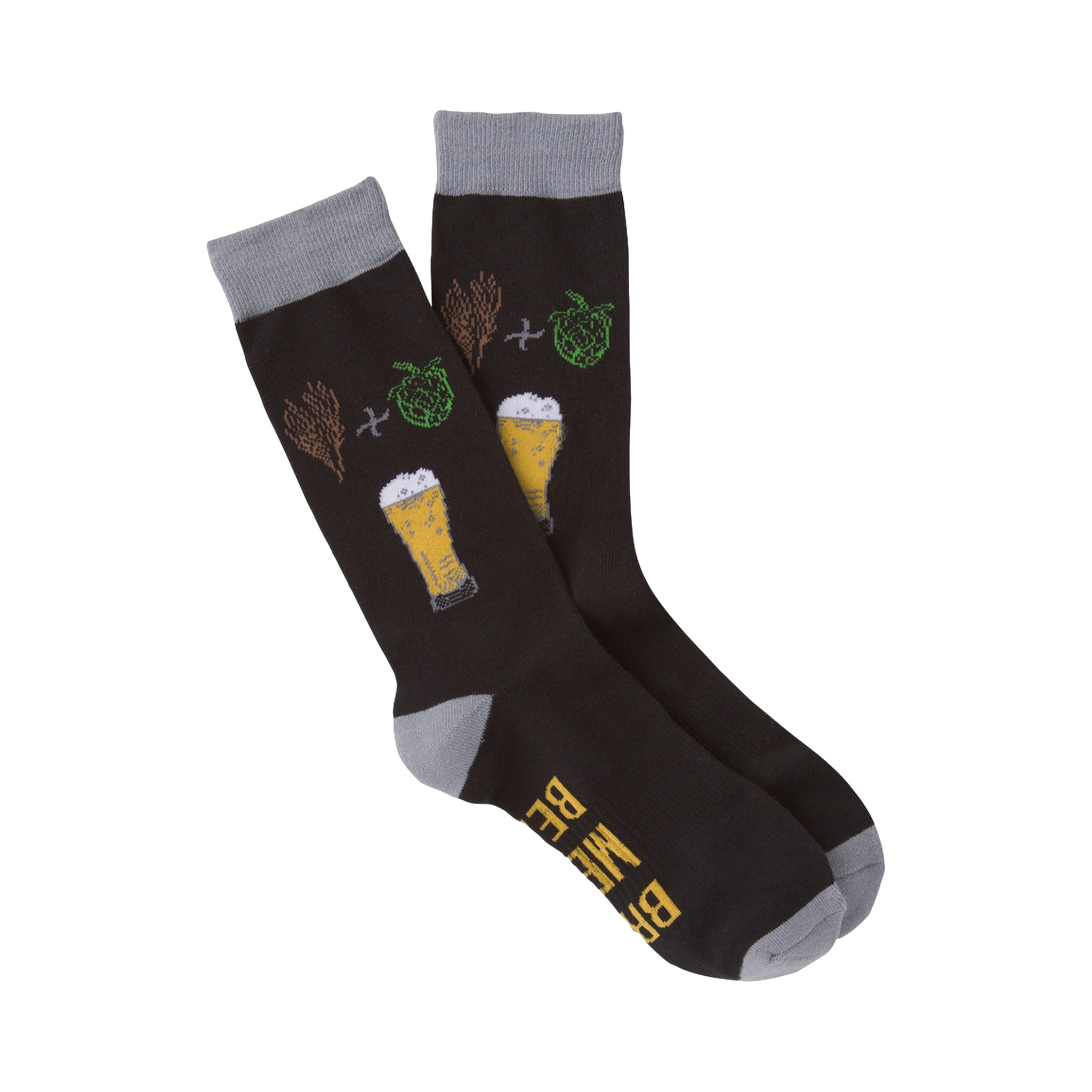 Hop into these cool socks and you'll BARLEY believe how comfortable they are! This refreshing pair of black and gray crew socks features a barley and hop symbol equaling beer. Perfect for anyone who enjoys a cold brew on a hot summer day. Bottoms up!