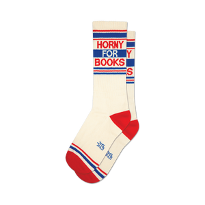 Unleash your inner nerd with our "Horny for Books" socks! These striking socks sport bold red and blue stripes with playful hints of red at the heels and toes, making every step pop with color and character. Perfect for library runs, book club meet-ups, or cozy reading sessions at home, these socks are a must-have for any book lover who likes to show off their literate side with a twist of humor. Flaunt your passion for pages at your next casual outing or give them as a quirky gift to your bibliophile friends. Who said reading can't be fun and fashionable?