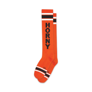 Kick off your boring socks and step into a world of sass with our Horny Knee High socks! These socks are made for men and women who need a dose of sassy-socks-style. With a bright orange hue, black and white stripes at the top, and the word 'horny' across them, these socks can be your subtle way of making a bold statement.