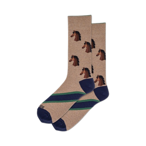 Buckle up and gallop into style with these brown crew socks adorned with a herd of dark brown prancing horse heads. The perfect accessory for any horse enthusiast, these fun socks will have you feeling like a champion on the racetrack or a majestic stallion in the pasture. Plus, with their two light blue stripes at the top and dark blue bottoms, they're sure to add a touch of equestrian flair to any outfit.