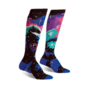Blast off into the cosmos with these Horsehead Nebula socks! Adorned with a dark blue background featuring a vibrant nebula and a horsehead-shaped patch, these celestial knee-highs are sure to transport you to the far reaches of the universe. Get ready to explore the wonders of space with every step, ladies!