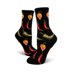 Spice up your wardrobe with our Hot Chili Peppers socks! These fiery footwear feature a vibrant pattern of red, orange, green, and yellow peppers in various shapes and sizes, sure to turn up the heat in any outfit. Whether you're a food enthusiast or just looking to add a touch of sizzle to your style, these socks are guaranteed to make you stand out from the crowd. Plus, with their black background, they're as versatile as they are eye-catching! They're made for women and come in crew length, making them perfect for any occasion. So grab a pair and let your feet do the talking!