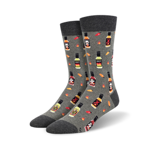 If your feet could talk, what would they say? Yours are so hot, they're on fire! We're Hot In Here Mens Crew food & drink novelty sock with a gray base and a hot chili and fire and grim reaper pattern. So kick off your shoes and treat your feet. They've got a lot to say.