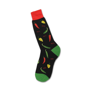Step into the spiciest trend with our "Hot Peppers" socks! These bad boys are hotter than a habanero, featuring a sizzling pattern of red, yellow, and green chili peppers outlined in white and the word "HOT!" written on them. With a red toe and heel, these socks are the perfect way to add some heat to your feet. Whether you're a foodie, a fan of spicy memes, or just someone who likes to walk on the wild side, these socks are sure to turn up the temperature. Get ready to spice up your sock game, because these chili pepper socks are the hottest thing since sliced jalapeños!