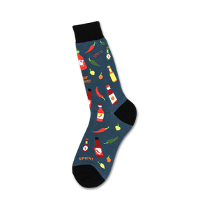 Kick your feet up in some spicy style with our Hot Sauces Socks! These crew socks for men feature a pattern of hot sauce bottles and chili peppers on a blue background, topped with "Hot Sauces" in bold white lettering. It's the perfect way to spice up your wardrobe, whether you're a chili head or just love a good pun.