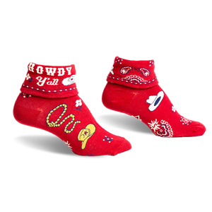 Ever notice how a splash of cowboy charm can turn an ordinary day into an adventure? Our turn cuff socks, emblazoned with cowboy hats and a bold "Howdy Y'all" greeting, are here to lasso some fun into your wardrobe. With a red canvas adorned with white and blue paisley patterns, these socks are not just about style; they're about embracing a free-spirited flair. Perfect for those who love a little wild west whimsy in their step.