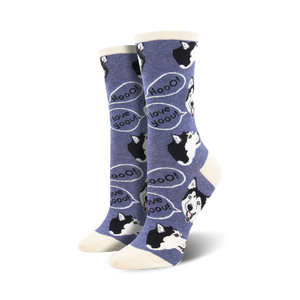 Show your love for dogs and add a touch of fun to your feet with these Howling for You socks. Featuring a pack of cartoon husky dogs inside hilarious speech bubbles, these socks are sure to bring a smile to everyone you meet. Whether you're chasing after your tail or just living life to the fullest, these crew-length socks will keep your feet cozy and stylish.