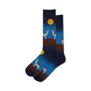 Howl at the moon with these ferocious wolf socks! Unleash your inner wolf and channel your wild side in these comfy crew socks. Featuring a pack of howling wolves under a celestial moon, these socks will make you feel like you're part of the pack. Slip them on and let the wilderness consume you!