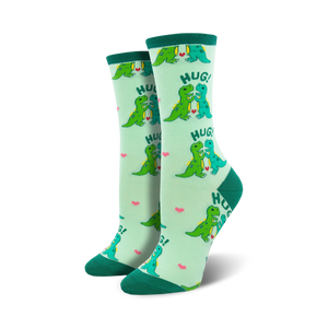 Dinosaur Hugs Socks: Crew socks for ladies with a happy crew of cartoon dinosaurs hugging each other. Aww-inspiring, huggable, and fashionable. Ideal for dino-loving ladies and anyone who needs a splash of cute colors and positivity. These socks will surely make you smile and bring out the inner child in you!