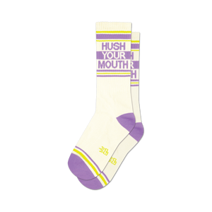 Wrap your feet in whispers with these cream-colored socks, accented with a hint of purple rebellion. Emblazoned with "Hush Your Mouth" in elegant purple script along the leg, they deliver a silent yet striking command. Perfect for those moments when words are superfluous, these socks are your go-to for maintaining decorum in style. Why speak when you can simply strut?