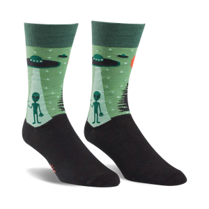 Believe in the extraordinary with these interstellar socks! Journey to the cosmos with each step, surrounded by vibrant aliens and shimmering UFOs against a backdrop of twinkling stars and evergreen trees. These out-of-this-world socks add a touch of intergalactic fun to any outfit and are sure to stir up cosmic conversations wherever you go.