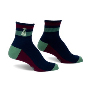 These socks are for anyone who's ever looked up at the night sky and wondered. With a dark blue body, they feature bold stripes of deep burgundy and a cool sage green around the ankle cuff. The heel and toe areas are also that refreshing sage green. On the outer ankle of each sock, there's a small, light-colored figure with a distinct large head and eyes - a classic alien silhouette. Just above its head, a small, disc-like shape is visible, perfectly hinting at an unidentified flying object. A diagonal slash of burgundy adds some flair to the foot. These are comfy ankle socks designed to keep your feet feeling good while you ponder the mysteries of the universe.