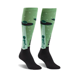 For those of us who no longer wish to live on this planet anymore, there is a solution. Look up to the stars and phone home, your mother-ship will be arriving soon! These crazy, cool green and black knee high socks feature an awesome alien looking to take you home. Gift your far out, UFO loving friends these funny novelty socks.