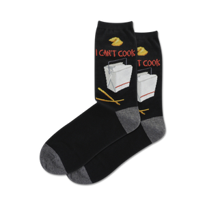 Got the takeout taste without the dreaded chore of cooking? You must be rocking these "I Can't Cook" ankle socks! The grey toes, heels, and cuffs balance out the bold black base, while the yellow lettering and takeout containers with chopsticks add a dash of humor. These socks are perfect for kitchen-challenged foodies, or those who want to pretend they are! Be warned, these socks may cause cravings for your favorite takeout dishes.