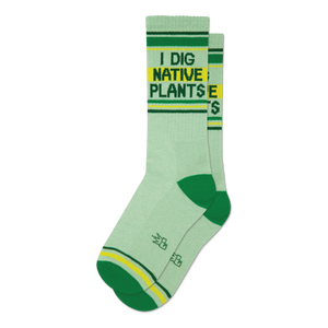 These socks are for anyone who loves getting their hands dirty, or just appreciates the beauty of local flora. They come in a fresh light green color, with bold stripes of darker green and bright yellow at the cuff and around the toe and heel. Up top, the sock spells out "I DIG NATIVE PLANTS" in a stacked design, with yellow letters on dark green bands for "I DIG" and "PLANTS," and dark green letters on a yellow band for "NATIVE." Look closely and you'll spot little dark green icons, almost like tiny shovels, patterned along the foot. They are perfect for tending your garden, hitting a plant nursery, or just showing off your green thumb.