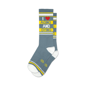 These socks aren't just a cozy cover for your feet; they're a cheeky nod to the inevitable. Decked out in a sleek gray with playful red and yellow stripes, these socks sport a bold declaration of 'I Heart Aging and Dying' that's sure to raise eyebrows and start conversations. Perfect for those who like their style served with a side of existential humor. Suitable for all, because let's face it, aging is the ultimate unisex experience