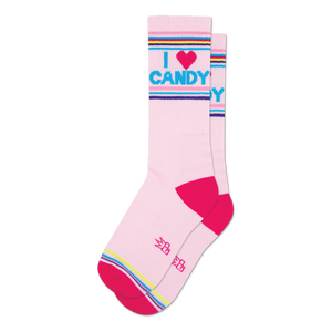 Grab these light pink socks if you're all about the treats. Up near the cuff, they boldly declare "I ❤️ CANDY" with a bright red heart, set against a background of crisp light pink. Colorful stripes, in shades like pink, blue, yellow, and purple, frame the text. The heel and toe on these socks really pop with a bright fuchsia pink. Plus, look closely on the foot, and you'll see small, abstract shapes visible on this side that look like little candies, outlined in a darker color, adding even more fun to the design.