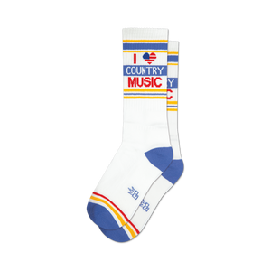 Let's twang it up a notch, shall we? These all-American socks are your backstage pass to toe-tapping, barn-storming country vibes. Crafted in the USA, they’re a nod to the heart and soul of country tunes—without requiring a pickup truck in your driveway. Decked out in crisp white with snazzy blue and yellow details, these foot wrappers sport a love note to country music right on the calf. And yes, that heart? It’s a star-spangled banner all its own. Slide on a pair, hit play on your favorite track, and let your feet hum along to the rhythm of the land.